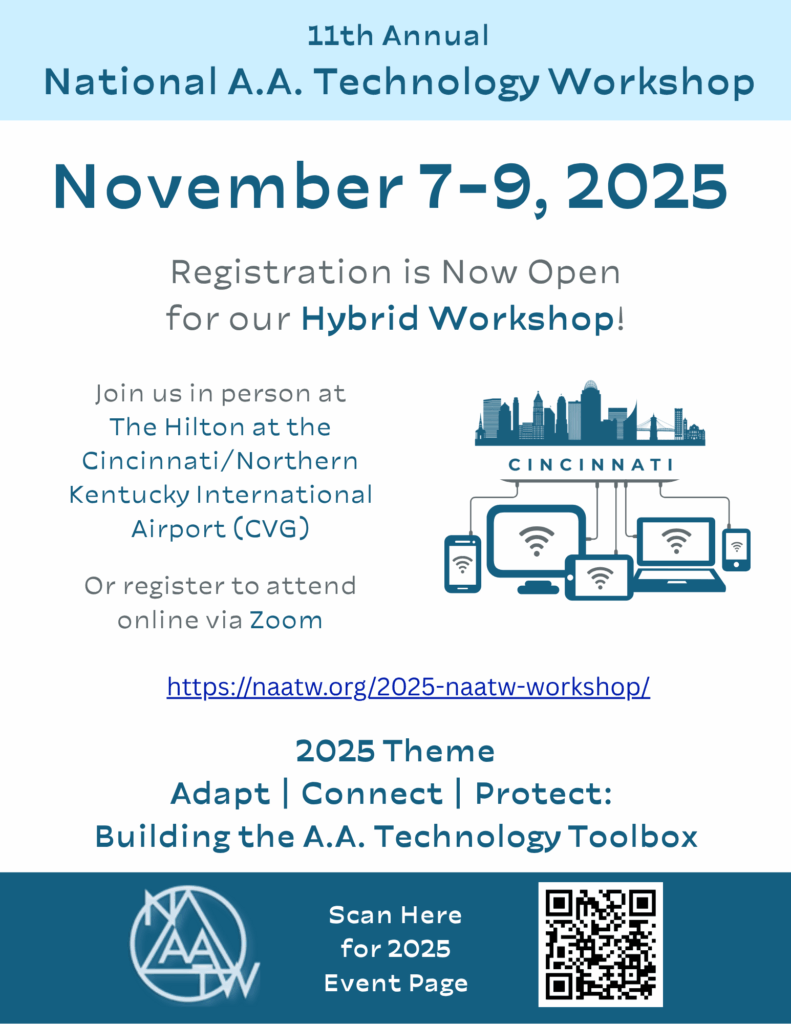 The National A.A. Technology Workshop (NAATW) is an annual gathering of A.A. members who use technology to help carry the message of recovery. It offers a chance to share experience, strength, and hope in tech-related service, connect with others facing similar challenges, and bring new ideas back to your home group and service committees. Click here to learn more.