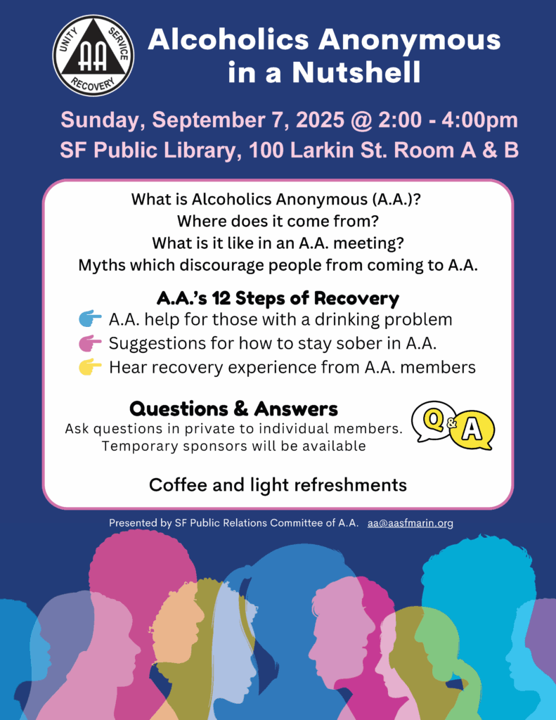 Please join the San Francisco Public Relations (PI-CPC) Committee for their annual public presentation at the San Francisco Public Library (SFPL). A.A. members who are willing to share their experience and/or be available as a temporary sponsor are especially needed. This is a live in-person presentation and event and will not be documented or broadcast in accordance with A.A.’s Twelve Traditions.