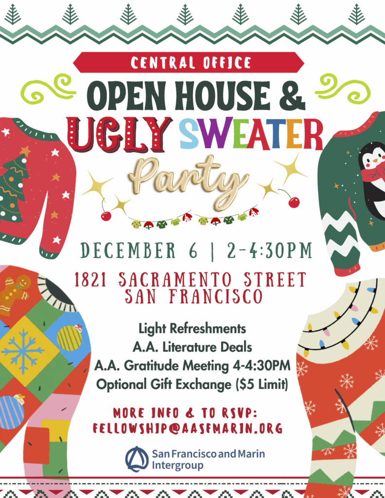 Celebrate the holiday season at Central Office will an A.A. Gratitude Meeting, (optional) gift exchange, deals on A.A. literature, food and fellowship. Wear your ugliest holiday sweater or come as you are. RSVP appreciated! Email [email protected].