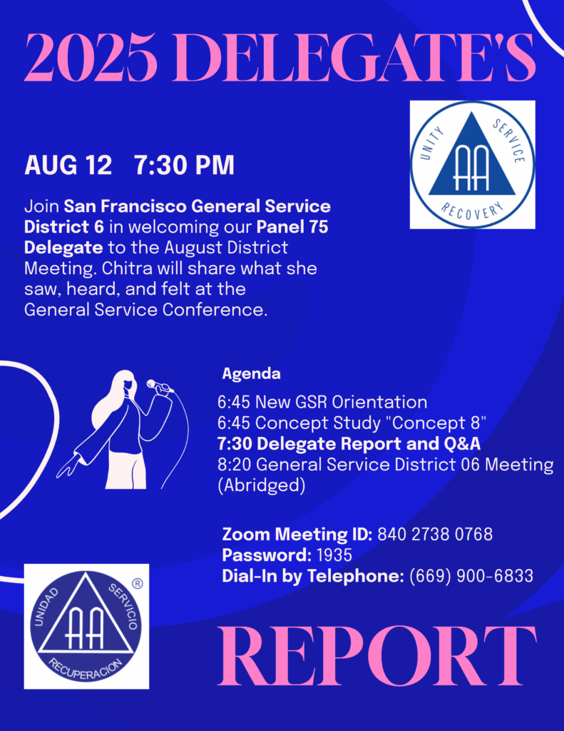 San Francisco General Service invites all A.A. members to attend the August District meeting to hear our Area Delegate share the results of the 75th General Service Conference and answer questions.