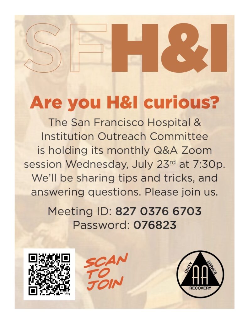 Monthly Q&A session for curious A.A. members and new H&I representatives. Bring your questions and concerns! Meeting ID: 827 0376 6703. Password: 076823. Click to Join.