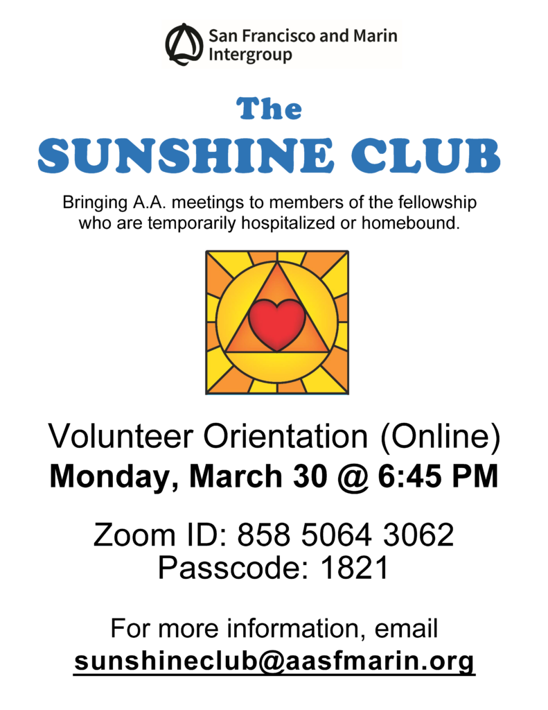 Requirements for Membership: One year of sobriety and attendance at one Sunshine Club Orientation. Join via Zoom.