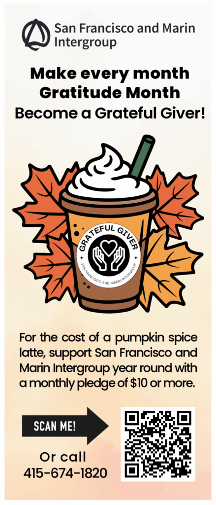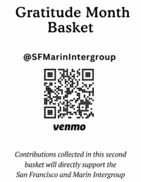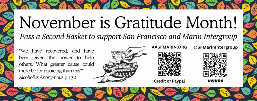 November is Gratitude Month and we are passing the basket a second time to support San Francisco and Marin Intergroup’s many 12th Step services, including running Central Office, operating the 24-hour helpline and maintaining the website. Gratitude Month contributions can also be sent via Venmo @SFMarinIntergroup or online at aasfmarin.org/gratitude. Thank you!