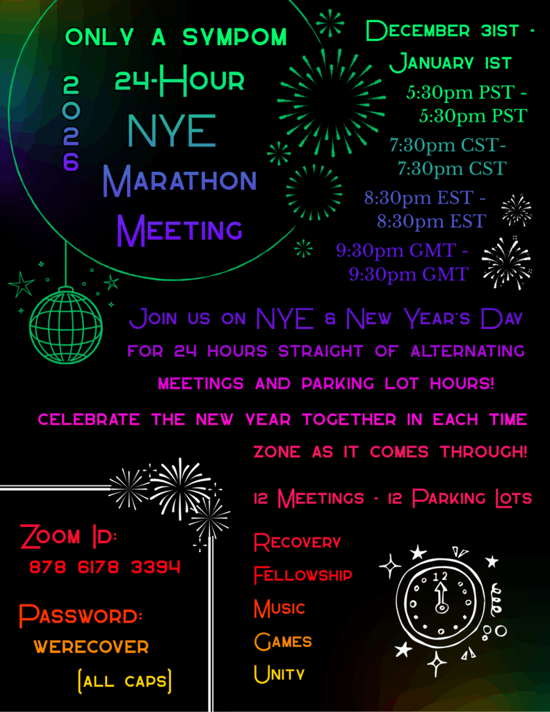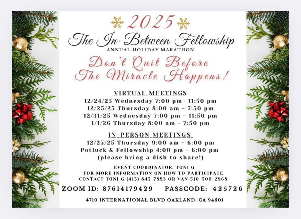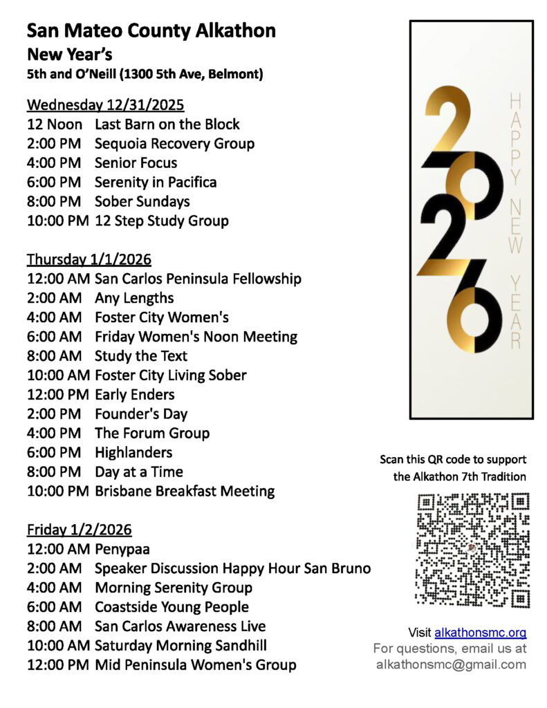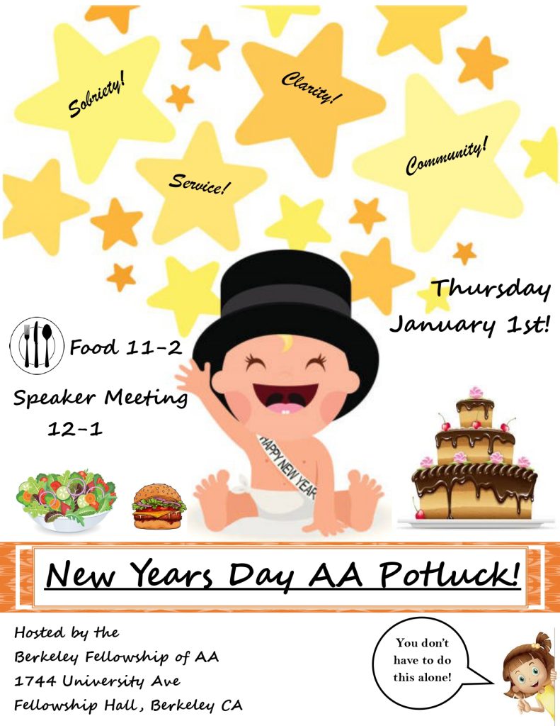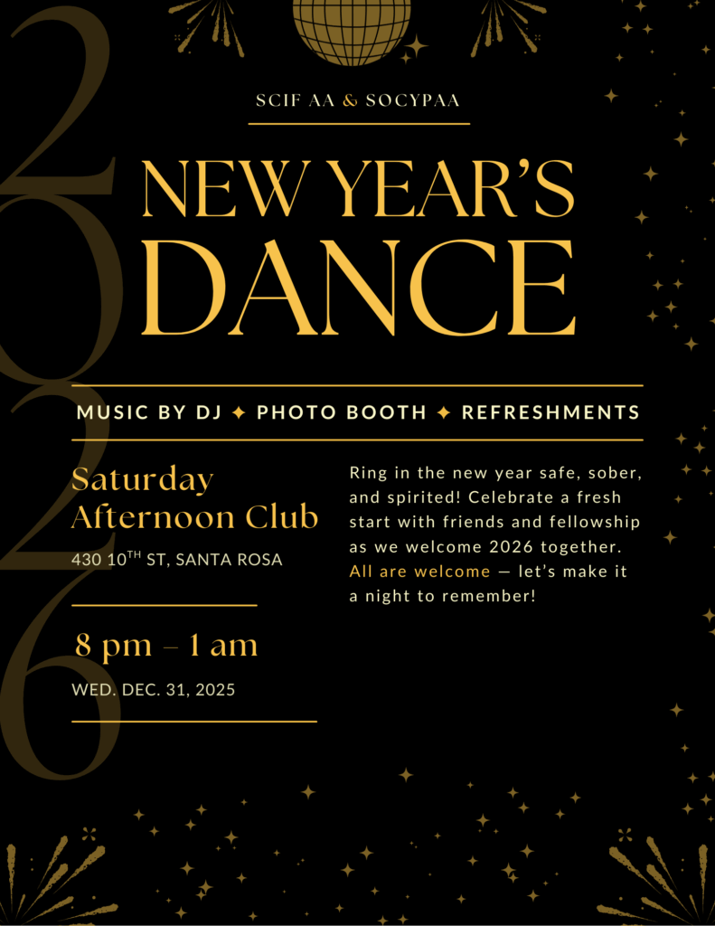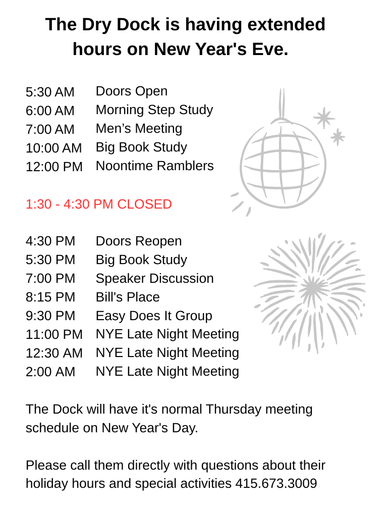 PLEASE NOTE: Central Office has not been notified of alcathons (continuous marathon meetings) taking place in San Francisco on New Year’s Eve or Day. On December 31. (NYE), the Castro Country Club* has extended hours until 1:00 a.m. and The Dry Dock* has extended hours until 3:00 a.m. On January 1 (NYD), the Castro Country Club will be open its regular hours of 7:00 a.m. – 9:00 p.m. The Dry Dock is closed in the afternoon. We have no been informed of any special holiday schedules at the Gratitude Center or Mission Fellowship.