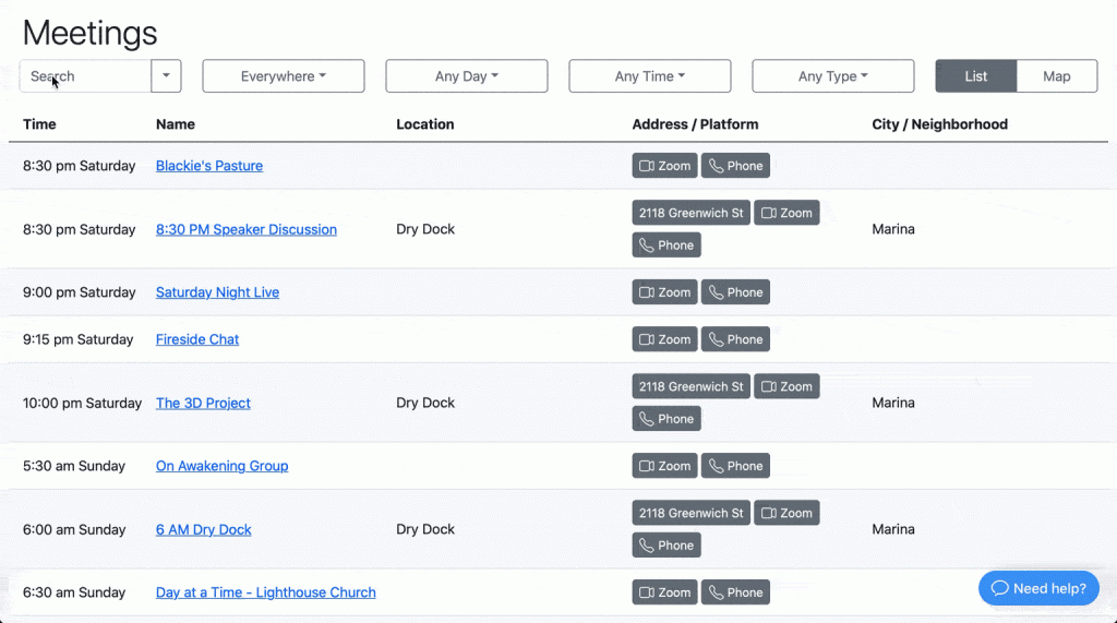 Let’s say you wanted to search for an exact match of a search phrase instead of each word individually. For example, you’re looking for the meeting named Sober Living and you want to weed out as many irrelevant results as possible. You can add quotations to either side of those search terms: “Sober Living”. The results will now show only meetings where that entire phrase shows up in one of the above fields, instead of each word appearing somewhere within those fields individually.